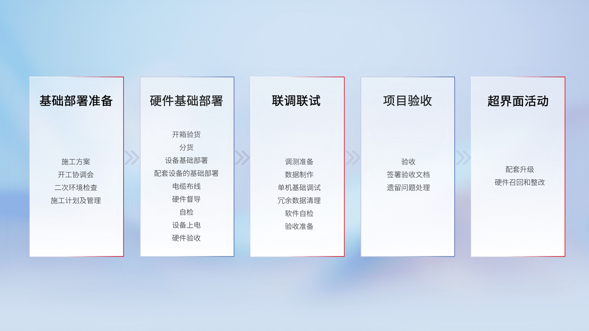 从基础部署准备、、、硬件基础部署、、联调联试、、、项目验收、、、越界面活动的全过程可追溯,,保证施工质量和进度。。